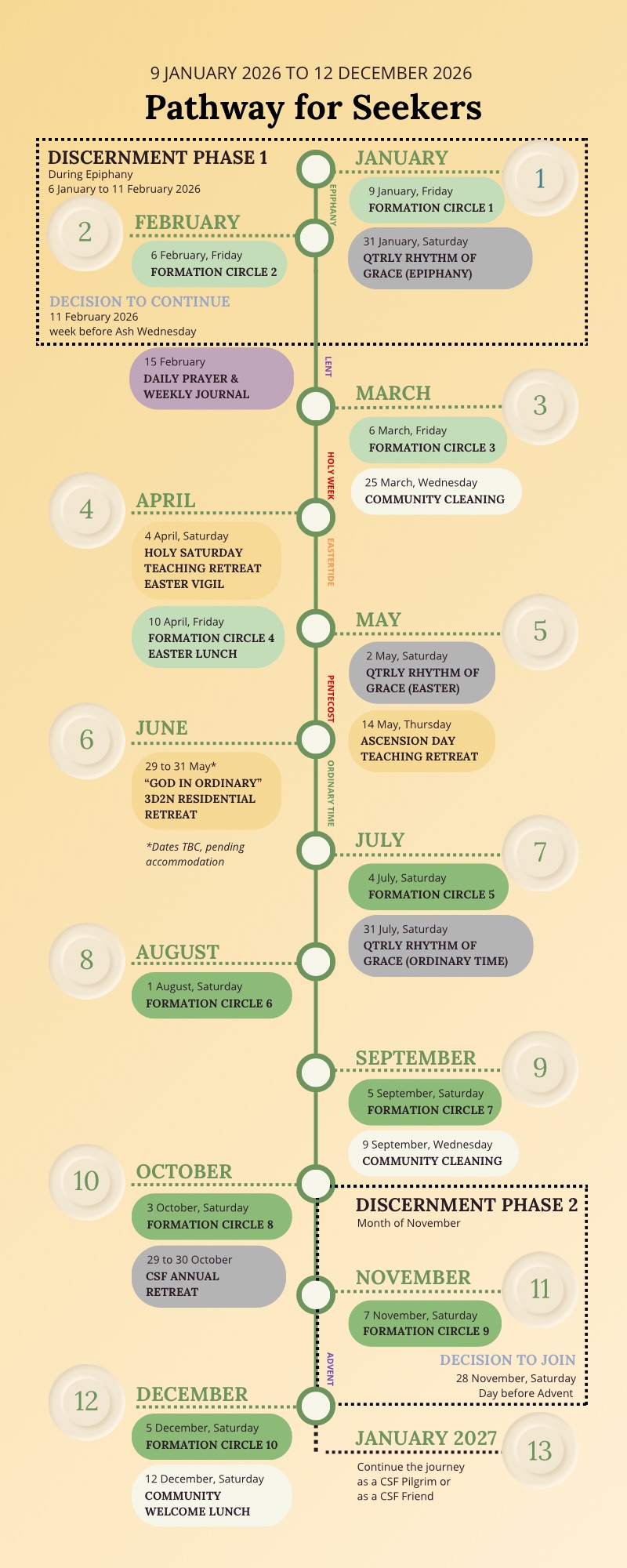 There will be a 3D2N residential retreat in June, afterwhich we join the 10YJ Companions in the mornings of 4 Jul, 1 Aug, 5 Sep, 3 Oct, 7 Nov and 5 Dec, continuing with our own formation circles in the afternoons. This allows space for our Pathway for Seekers community formation, and also time to interact with others in the CSF community.